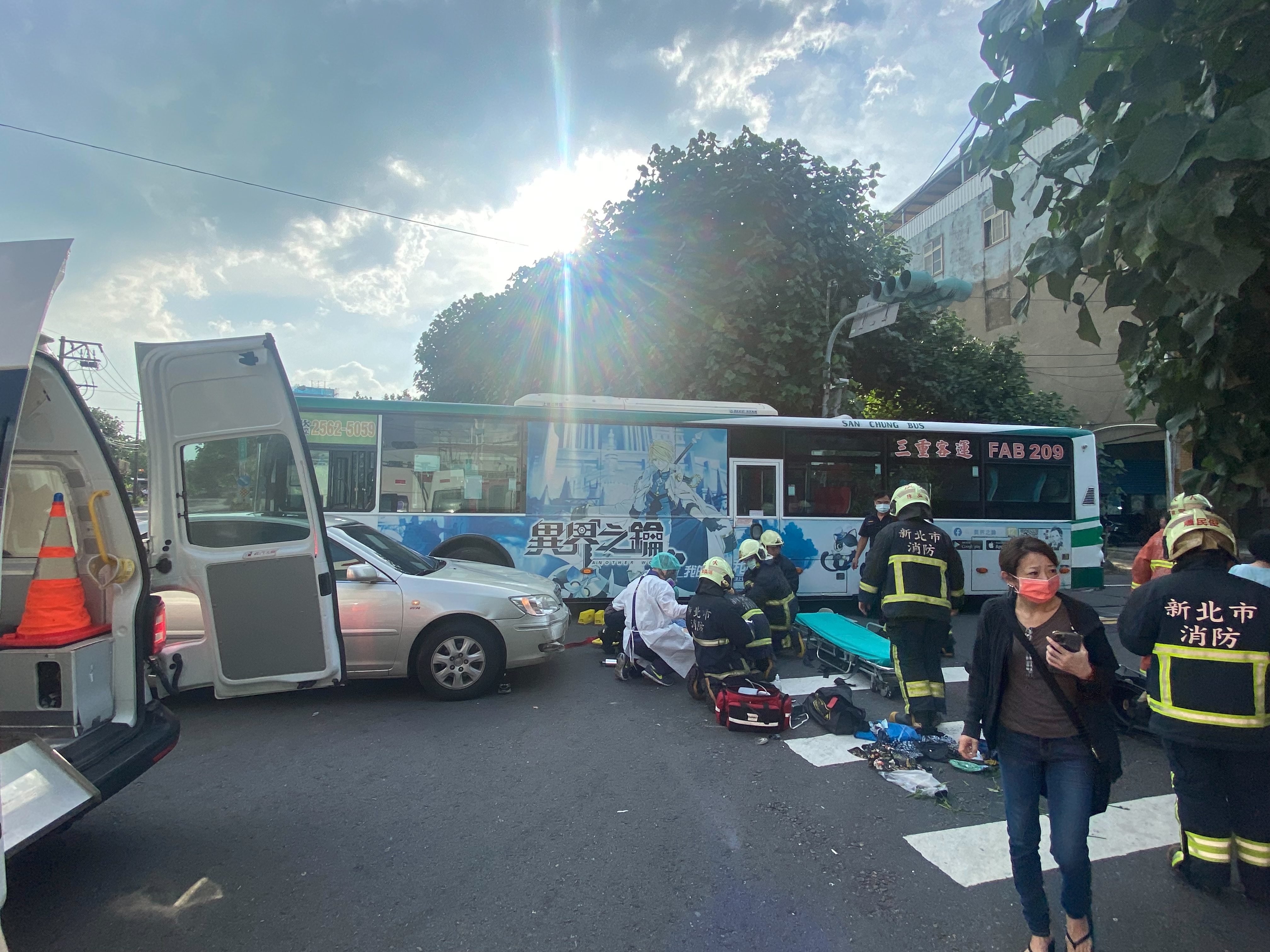 今(30)日下午4時許,新北市淡水淡海路上,一名女騎士騎機車載著7歲兒子,疑似違規闖路口的紅燈,被一輛右轉的轎車撞上,接著再被公車撞上,機車最後卡在公車底下,其中女騎士左小腿骨折,7歲兒子左手擦挫傷,雙雙被送醫救治,警方持續釐清車禍原因。