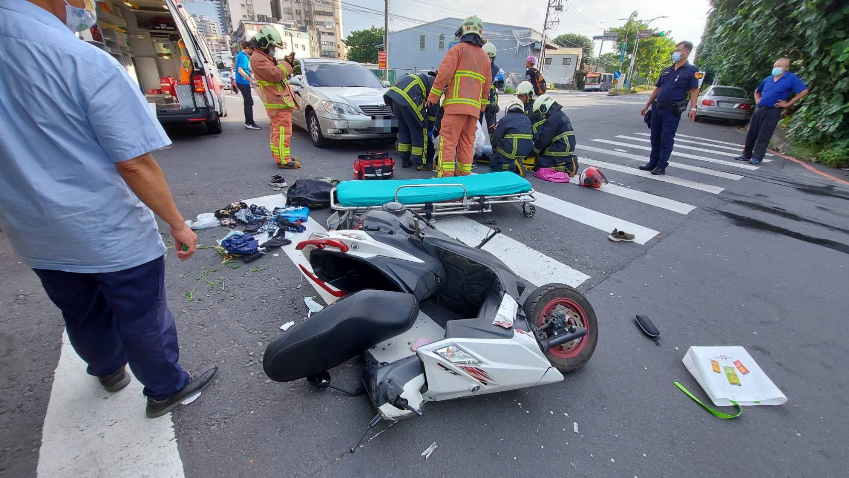 ▲▼女騎士騎機車載著7歲兒子,疑似違規闖路口的紅燈,被一輛右轉的轎車撞上。(圖/東森新聞)