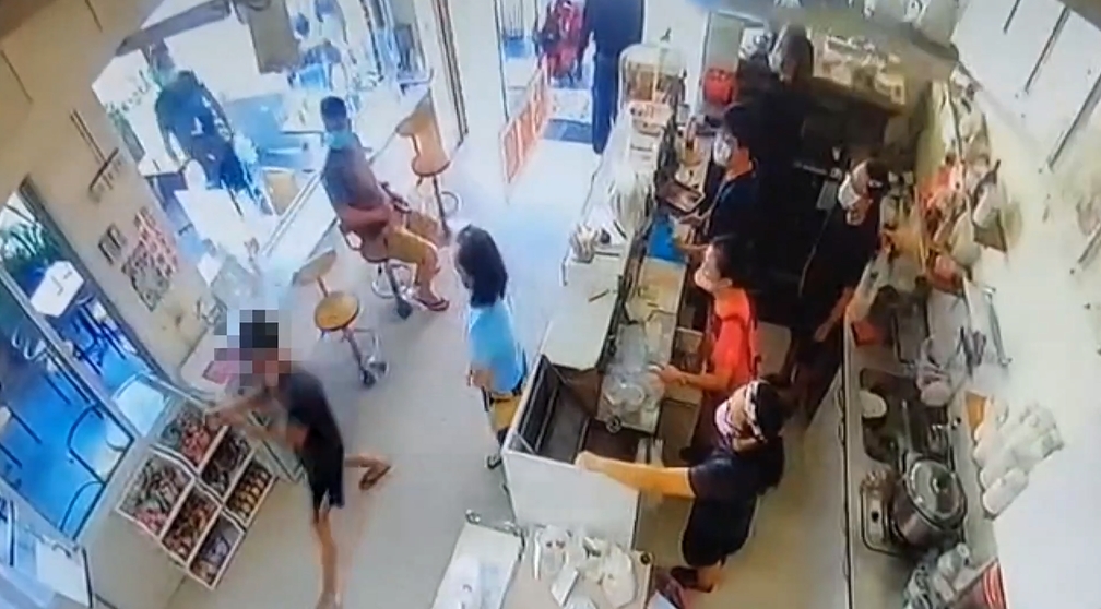 一名男子手持棍棒來到台南玉井這間早餐店,不顧一旁還有其他客人 ,直接衝向一名穿綠色背心男子,結果反遭對方一把抓住雙手,兩人發生拉扯,這時其他兩名男客人見狀,也過來協助 ,將持棍棒男子大外割壓制在地。畫面全被店內的監視器拍下。