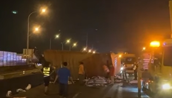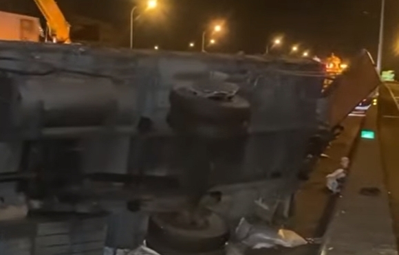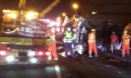 國道上大貨車翻覆,佔據中線外線車道,消防到場將駕駛從扭曲車頭救出,已經沒了生命跡象。