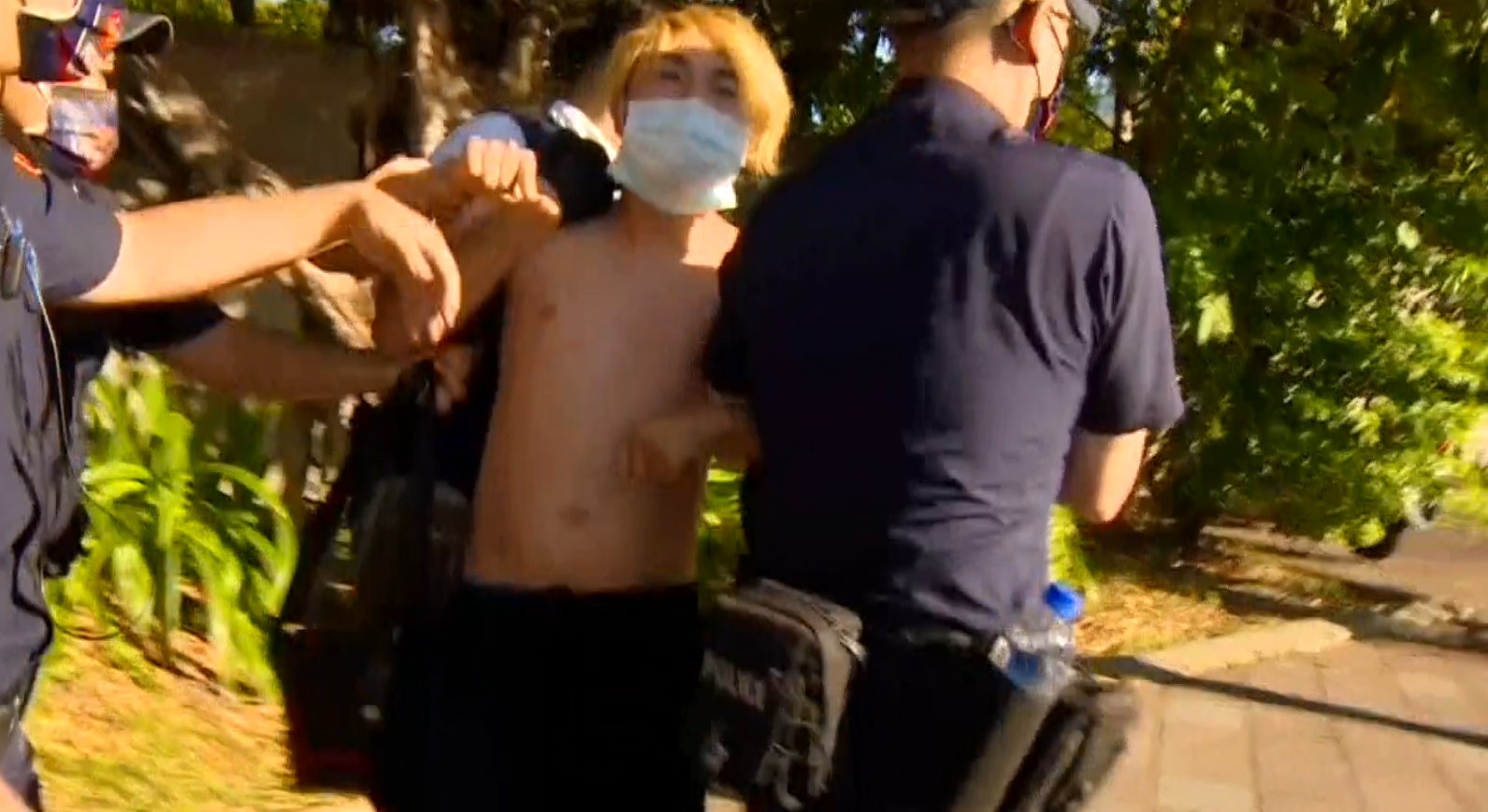 今(10)日是2021雙十國慶,為了確保典禮順利進行以及控管場外秩序,警方一共建置了2000名警力,還有狙擊手在一旁緊盯,以防有意外發生。而一早大約7點左右,裸著上身暴走抗議,口中還不斷喊著要「幹大事」,一旁的警方上前將他壓制,並依違反《社會秩序維護法》送辦。