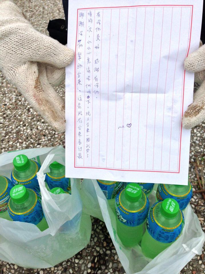 小女生送來的紙條上寫著,「謝謝你們幫助台東,這是我看過台東最慘的一次,小小心意請你們收下,繞了台東一圈我哭了,有你們真好,感謝有你們!」