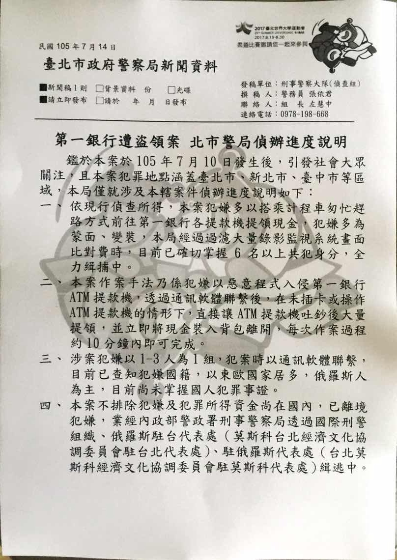 台北市刑大副大隊長林志誠表示,台灣這起憑空ATM搶劫,與在東歐國家ATM盜領案做案方式雷同,至於是否為同一組織,由於台灣首次發生這樣的案件,尚無資料比對,無法確認。市刑大目前已經掌握六個以上涉案人的真實姓名和背景,當中有已離境的兩名俄羅斯籍男子貝瑞夫左斯(Berezovskiy,34歲)和柏克曼(Berkman,28歲),另外四人還在台灣,包括一名帶著鉅款,入住君悅的安德烈斯、另一為穿著軍綠上衣的嫌犯、還有兩名還在確認當中。為了避免在國內的嫌犯企圖透過洗錢和地下匯兌將錢轉至海外,警方正在加緊追捕當中。