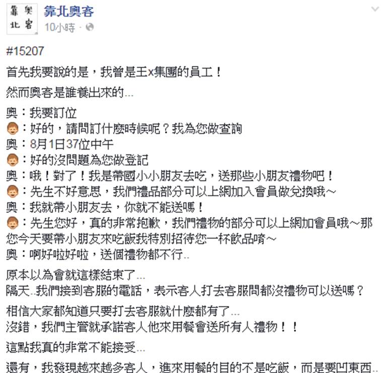 員工,在臉書《靠北奧客》PO文,指出「奧客是誰養出來的...」,認為公司的態度真的很重要,內文舉例他所遇到的奧客行為,雖然說服務業以客為尊,但台灣太多人不尊重服務生,認為都是因為王X集團養壞了客人,「不管客人說什麼的都對,服務人員沒了尊嚴!」