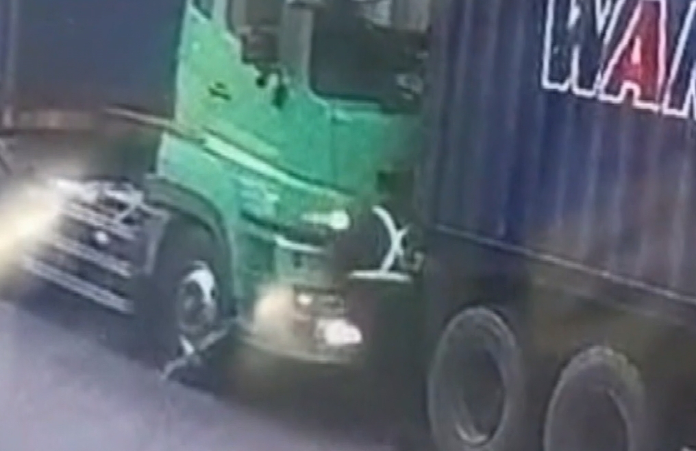 現場人員:「差不多了 差不多了。」一輛貨櫃車停在工廠外頭,不料這輛大車疑似沒拉手剎車,車子竟緩緩往前滑動 。趙姓司機注意到後,著急的衝到車頭前方 ,試圖想阻擋住,雖然貨櫃車看似有稍稍往後倒退一點點,接著司機就被夾在貨櫃車和貨櫃之間,倒在地上動彈不得 。