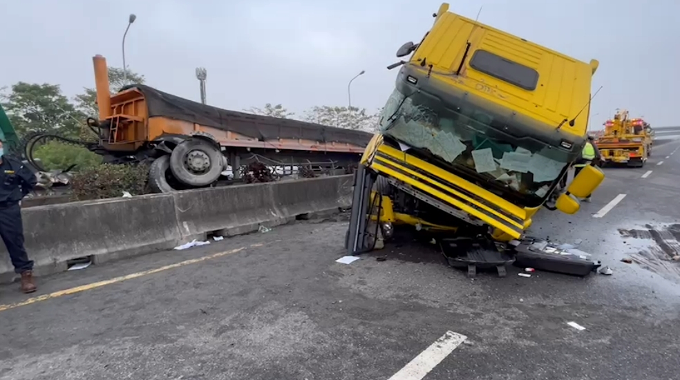 ▼槽車和砂石車衝撞中央分隔島。(圖/東森新聞)
