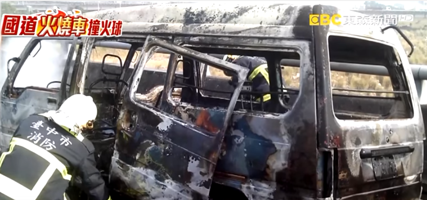 開車上國道路況還算不錯,突然,前方這輛行駛在內側的紅色廂型車,車後方先是冒出白煙,接著噴飛出黑色物體,沒多久,廂型車變成一團火球,後方的車輛連閃都來不及閃,直接往火球衝撞上去。行進間的廂型車,瞬間變成噴火龍,火焰在車道上蔓延,後方車輛駕駛眼前一片火海,簡直像電影特效情節一樣,把駕駛嚇壞。在火燒車之前,這輛廂型車底盤先冒煙,接著從底盤飛出像石塊,又像零件的物體,砸到後方車輛,沒多久整台車就陷入火海當中,還像噴火龍一樣,在車道上噴出一長串的火焰。消防分隊員蘇昕岳:「開車的時候我突然聞到有一個異味,那個副駕駛乘客,回頭看就發現,車底有火光,他們駕駛就立刻把車子靠在路邊。」消防隊趕到現場,迅速將火勢撲滅,廂型車撲滅火勢後,燒的只剩下支架,連紅色車身的漆都熔光了。廂型車駕駛是54歲許姓婦人,當時她載帶著兒子,從台中開往苗栗要去做生意,沒想到在中山高北上155.3公里,苗栗三義路段,發生火燒車。