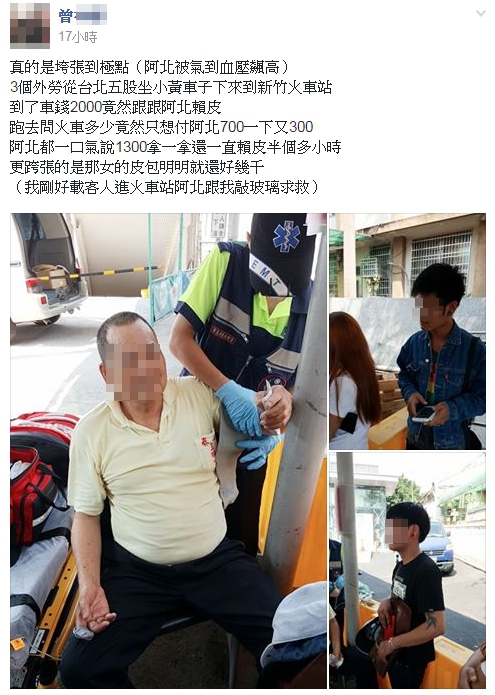 同樣身為小黃司機的曾姓男子,正好載客人進到新竹火車站,被這名遭3外勞拗到血壓飆高的阿伯司機敲戶求救。曾姓運將把過程全部PO上臉書。他表示,3個外勞從台北五股坐小黃車子下來到新竹火車站,車資總共2000元,三名外勞嫌貴,於是跟司機討價還價,還跑去問火車票價多少,後來得知票價後,就盧說要比照火車票,只要付700元,其間還一度砍到只想付300元。