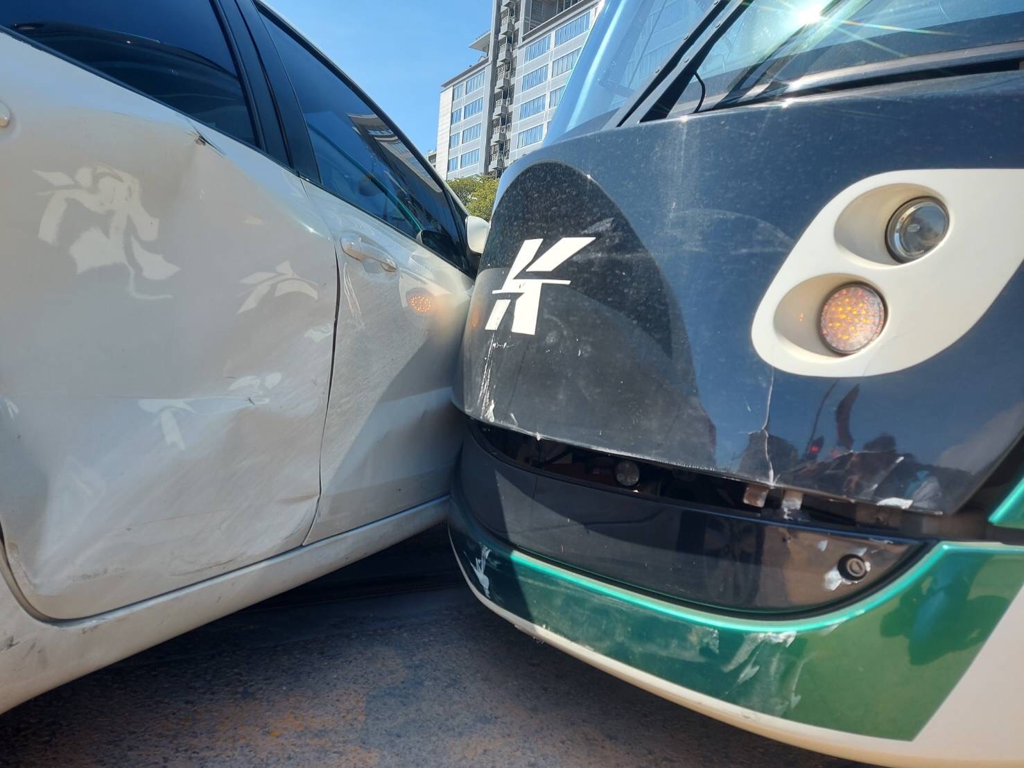 高雄輕軌列車中午行駛途中遭汽車擦撞,所幸無人受傷,已恢復正常營運。高捷公司表示,初步判斷為汽車未遵守交通號誌燈號違規右轉,輕軌車頭有損傷,後續確定肇責後將求償,新品更換連工帶料恐破百萬元。
