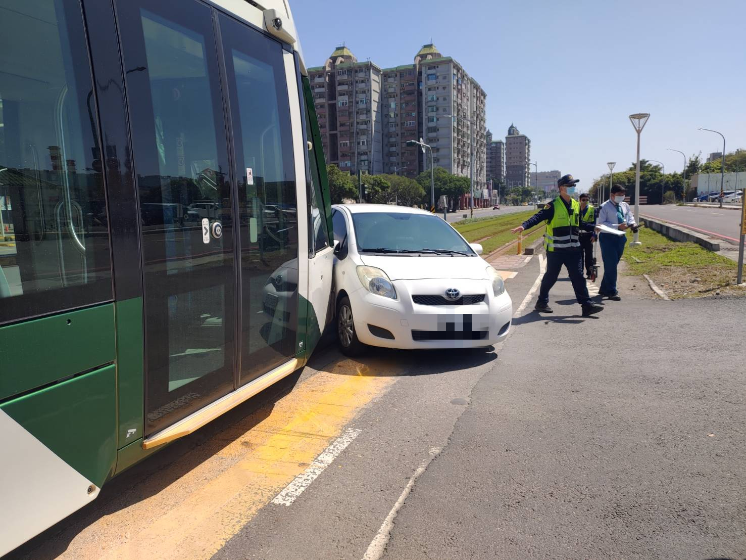 高雄輕軌今天中午12時43分,從C7軟體園區站下行往C6經貿園區站途中遭汽車擦撞,司機員緊急停車,車上乘客及汽車駕駛均無受傷。車上旅客清車後,步行前往下一站月台或自行使用其他交通工具離開。