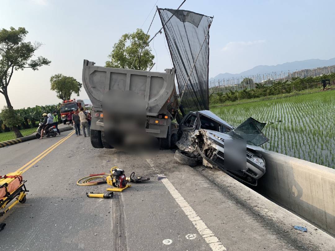 高雄美濃區今(5)日發生一起重大車禍!今日下午4點左右,一輛砂石車與自小客車,在復興街二段高美大橋附近發生擦撞,消防局獲報後出動6台車,共13人前往救援,到達現場後發現,47歲的砂石車女駕駛沒有大礙,而自小客車駕駛也已自行脫困,不過副駕駛座71歲的乘客,被救出時已經沒有呼吸心跳,救護人員連忙將2人送醫。至於車禍發生的原因,仍待警方進一步調查。