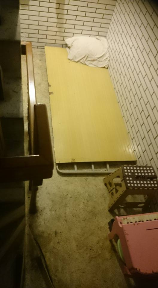 住民阿進最近開始在社區大樓擔任保全工作,今天去看看他工作狀況,恰好阿進外出處理事情,他的主管便向我介紹這間想出租給阿進的房間(其實我也不知道算不算得上房間,至少主管是這樣說的),這是位在大樓一樓和地下室中間的樓梯間,舖有一塊木板作為床和一個二手的枕頭、電扇。