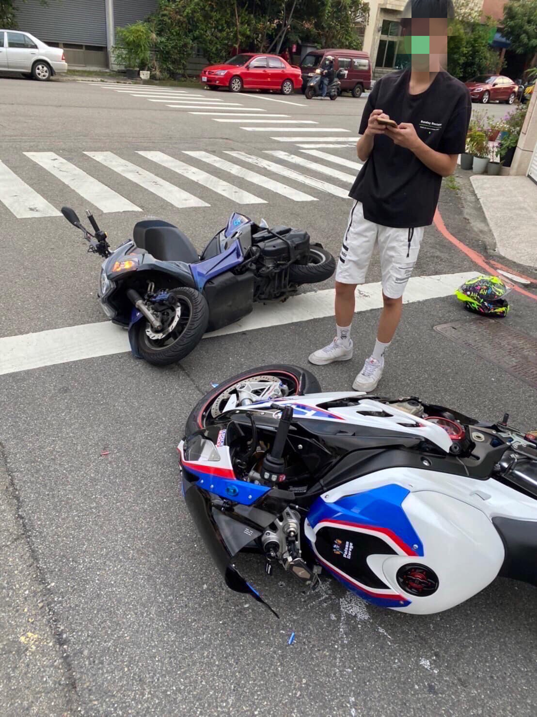 ▼洪姓騎士(黑衣)違規撞上要價百萬的豪華重機。(圖/翻攝自臉書社團「重機車友 ❘ 各區路況、天氣回報中心」)