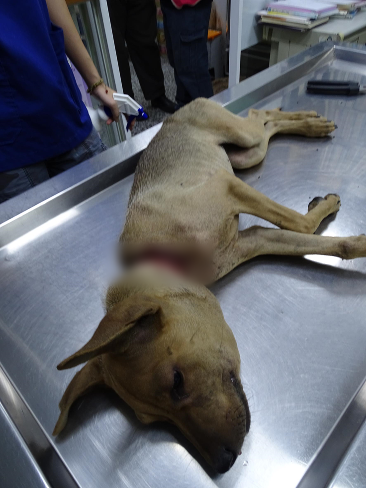 橡皮筋勒住,頸部皮開肉綻,頭部腫脹如球,救援的時候狗狗已無法行動,甚至連哀叫也無聲。緊急送醫開刀後,還發現牠的氣管被勒破,慘不忍睹。