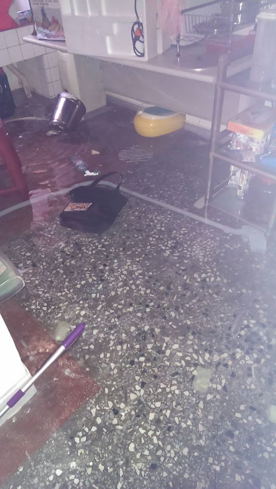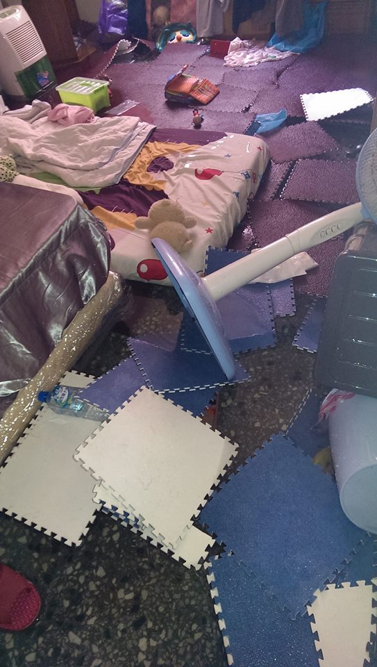 消防隊灑水打火,結果回到家後「整個汪洋一片,我家也毀了,當下我整個哭出來了…」。在火災一開始,她本來和孩子在房間裡玩,可是突然聽到有人大叫她的名字,隨即爆炸聲大響,她就馬上抱著孩子往1樓衝去,家裡和現場都濃煙密布,她就趕緊到鄰居家裡避難。直到下午5點半左右,火勢雖然撲滅了,但是現場都被封鎖了起來,家裡又亂又沒電,她只好把重要物品帶到鄰居家暫時打地鋪過夜。