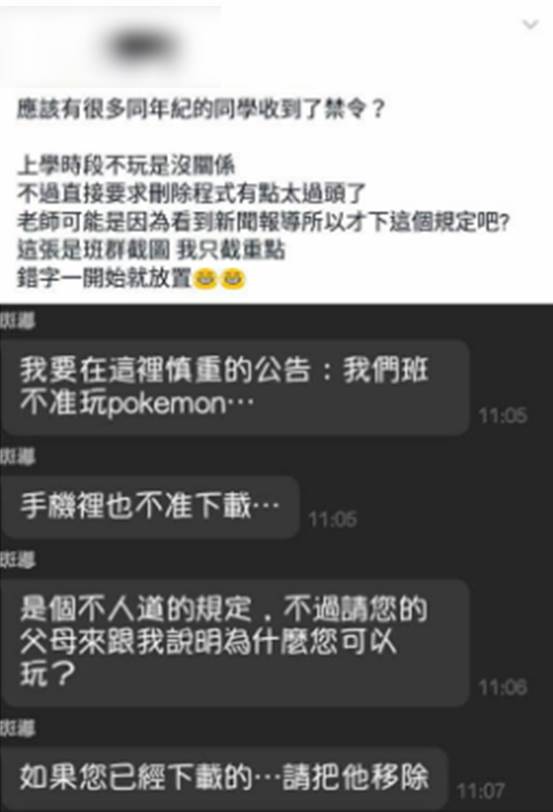 LINE的對話截圖中可以看到,班導在群組裡公告,「我們班不准玩pokemon…」、「手機裡也不准下載…」,指出雖然是個不人道的規定,但是如果想玩請您的,「請您的父母來跟我說明為什麼您可以玩?」,最後還強調,「如果您已經下載的…請把它移除。」原PO表示,上學不玩沒有關係,但直接要求刪除會不會有點太過頭。