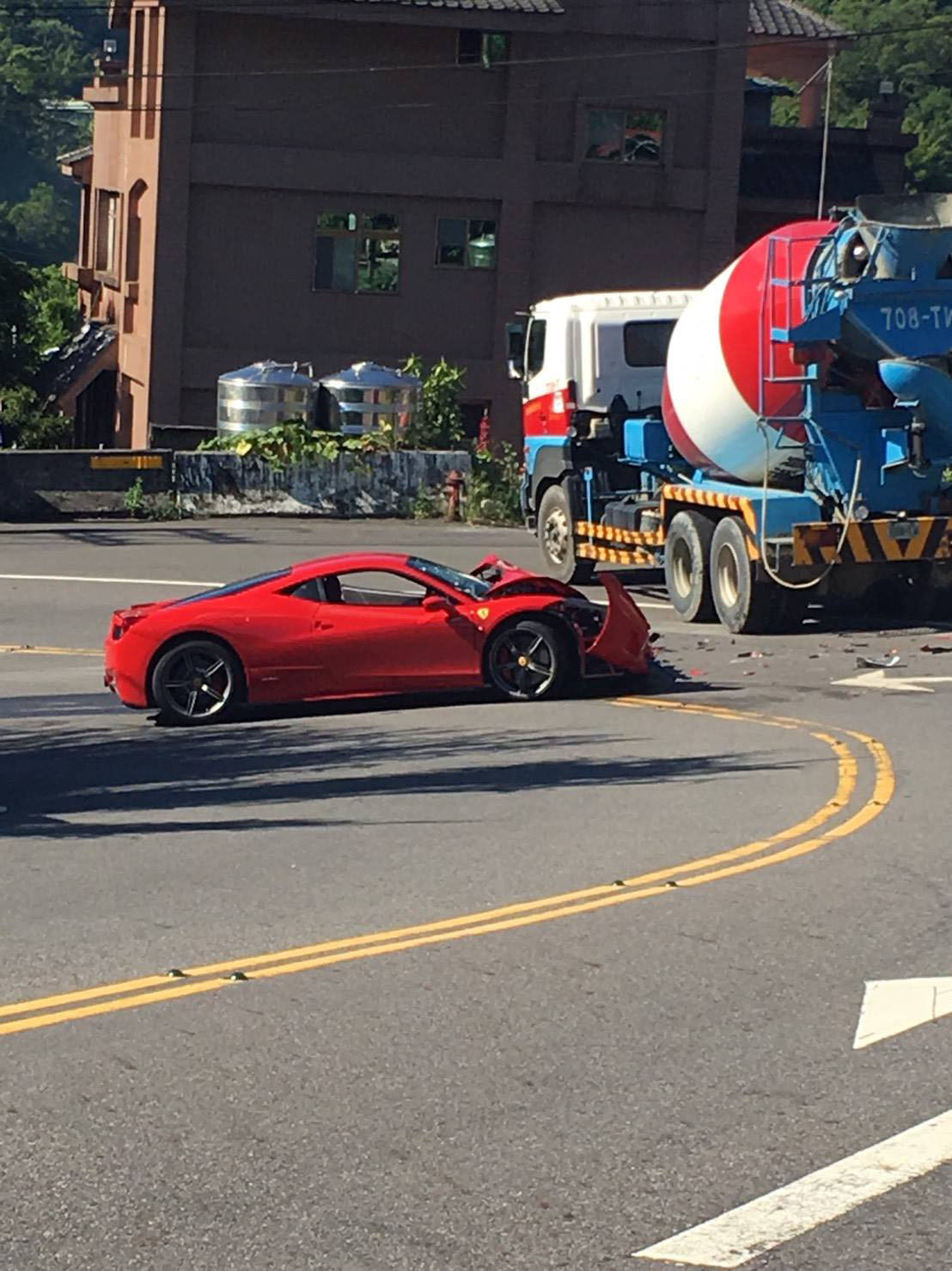 這名網友在「爆料公社」上PO文,表示這起車禍發生在16日下午3時20分左右。寬敞的馬路上停著一輛車頭全毀的法拉利458和水泥預拌車。根據了解,事發當下,警方獲報後隨即趕往現場,並對余姓法拉利駕駛進行酒測,確認並無酒駕。而余男則表示由於路況不熟,再加上該路段是個大彎道,才會一時失控撞上水泥車。