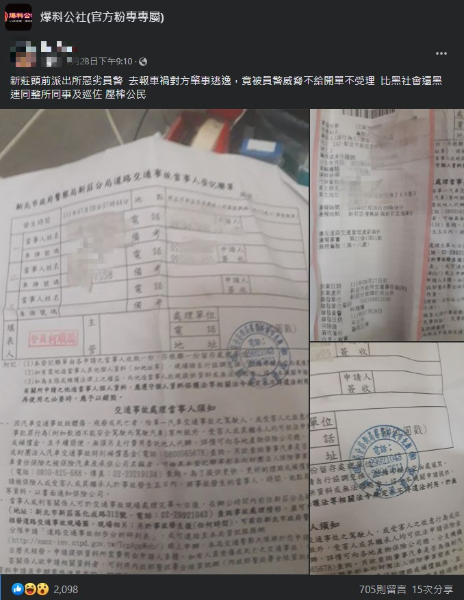 廖男在臉書「爆料公社(官方粉專專屬)」發文指出,「新莊頭前派出所惡劣員警,去報車禍對方肇事逃逸,竟被員警威脅不給開單不受理,比黑社會還黑,連同整所同事及巡佐,壓榨公民」;警方因此在底下留言澄清,過程都有依規定受理報案,而廖男無照同樣也是依規定開單,絕無「威脅不給開單不受理」。
