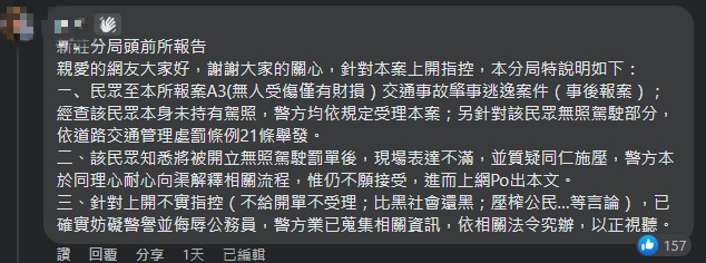警方接獲報案,依規定受理廖男提出的肇事逃逸告訴,並開立交通事故聯單,不過另外發現廖男無照駕駛,對他開單舉發。廖男疑似重機受損,自己又吃上罰單,心生不滿發文控訴警方,結果反遭員警留言打臉,討拍不成還引來網友批評。