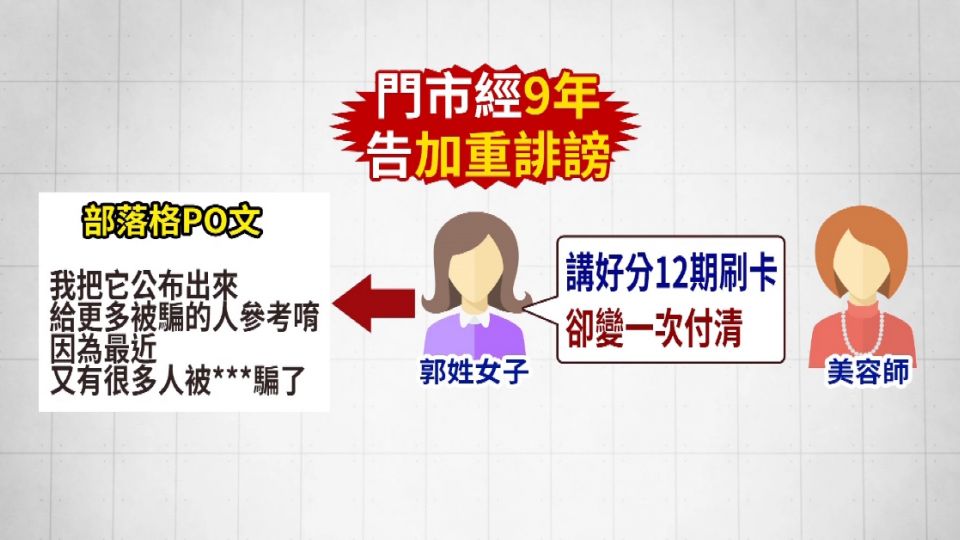 不少民眾都曾有在路上被美容師搭訕的經驗,台北一名郭姓女子被推銷後買了一萬元課程,但事後回想做臉到一半時,對方就開始推銷,半推半就下才刷卡,而且說好分期也變成一次付清,控訴業者不積極處理,氣得PO文提醒朋友小心,這篇文章一直留在網路上,業者在九年後才提告誹謗,由於過了告訴期,加上雙方退讓,檢方以不起訴處分。