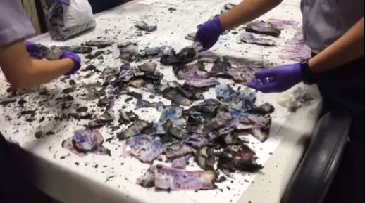 百萬現鈔」到一間土地公廟焚燒,警方到場後從香爐中挖出燒毀的鈔票,目前仍有部分紙鈔餘燼仍待鑑定。