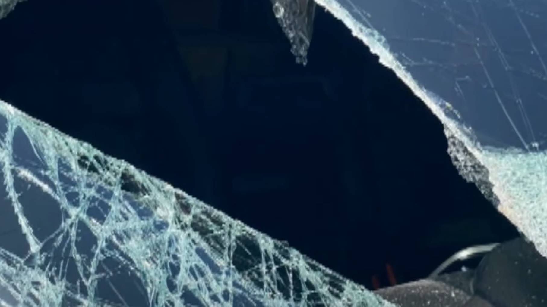 ▼車窗被鐵片擊中,擋風玻璃破了個大洞,坐在副駕駛座的妻子遭重擊。(圖/東森新聞)