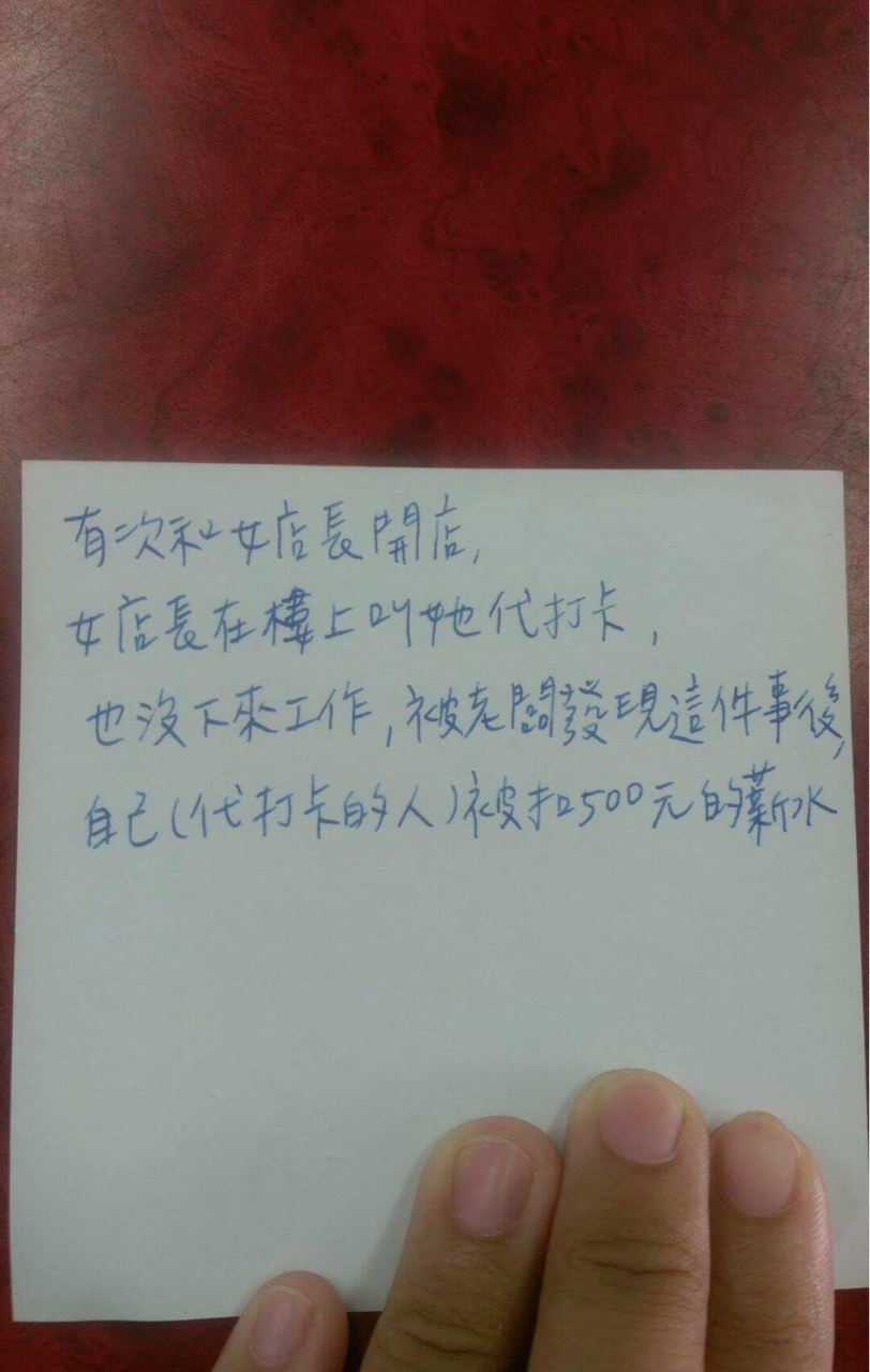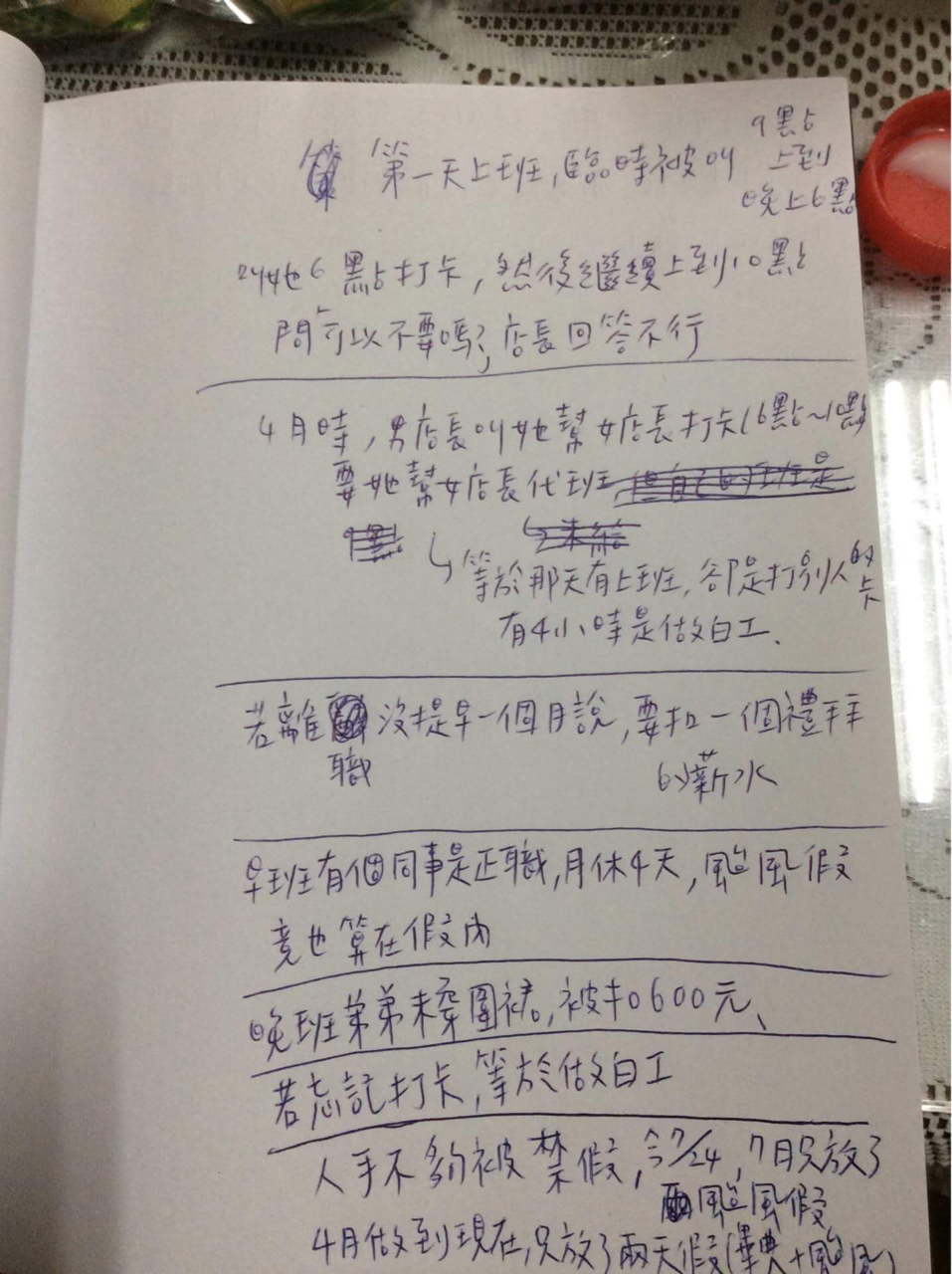 代PO在PTT上的網友表示女學生在tea's的台南永X分店打工,時薪90元,她因為很需要這份薪水,才拖到快離職才會請網友幫忙代發。網友表示,女學生打工的這家飲料店,會讓她下班後,打完卡繼續上班但不支薪,或者是幫女店長打卡代班,但女學生等於無薪上班,也曾經代女店長上班,被老闆發現,卻只有女學生一個人被扣500元薪水,也曾經4月到7月期間,因為人手不足,整整三個月,只放了畢業典禮跟颱風假共兩天假。