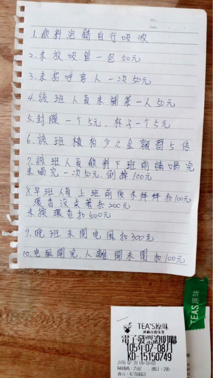另外,飲料店還列了各式各樣的口款規定,像是,飲料泡錯自行吸收;未放吸管一包50元;未招呼客人,一次50元;該班人員未補茶一人50元;封膜一個5元,杯子一個5元;該班結帳少的金額罰5倍;該班人員飲料下班前請喝完,未喝完一次50元,倒掉100元;早班人員上班前未拜拜扣100元,環香沒點著扣200元,環香沒換扣500元;晚班未關電風扇扣300元;電風扇開完人離開未關扣100元。