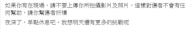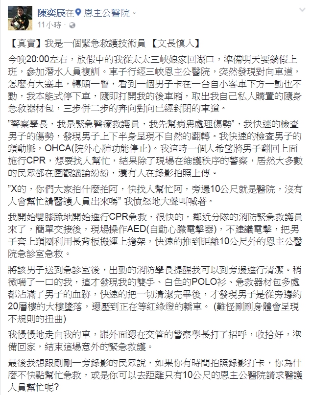陳姓消防隊員在快速檢查完男子的傷勢之後,趕緊替傷者進行CPR急救,很快的,臨近的消防隊員趕到後,趕緊接手將傷者送往附近的恩主公醫院急救,但很不幸的,這名墜樓的男子最後仍然不治身亡。在案件結束後,這名消防隊員在臉書上po文感嘆,「最後我想跟剛剛一旁錄影的民眾說,如果你有時間拍照錄影打卡,你為什麼不快點幫忙急救,或是你可以去距離只有10公尺的恩主公醫院請求醫護人員幫忙呢?」同時也呼籲,「如果你有在現場,請不要上傳你所拍攝影片及照片,這樣對傷者不會有任何幫助,請你幫傷者祈禱。」。
