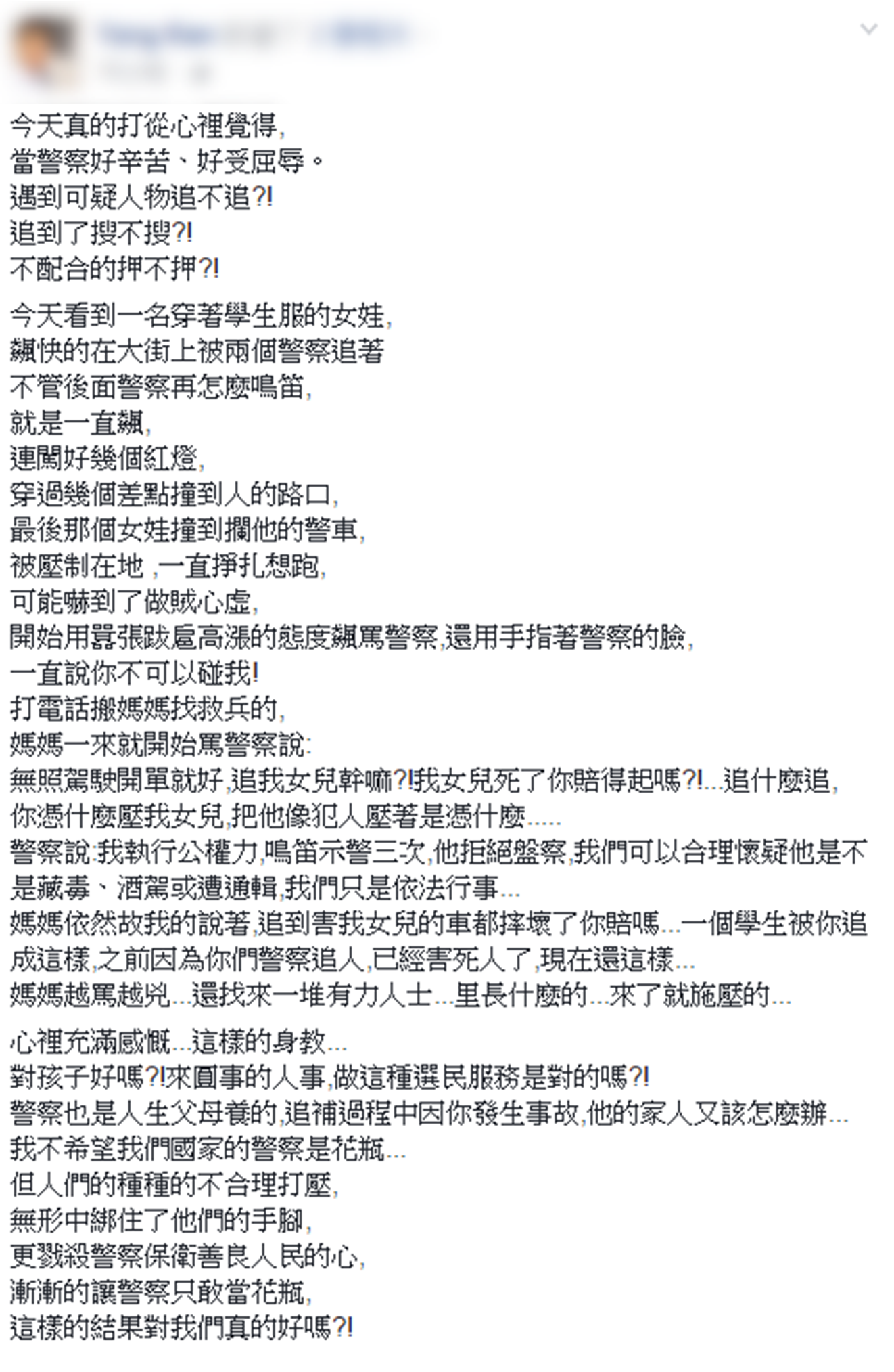 根據該目擊網友在個人臉書上的發文,表示自己親眼看到警察值勤時辛苦、受辱的一面,當時有一名身穿制服的女學生,騎著機車飛快地在馬路上奔馳,有2名警察在她後方追著,鳴笛了好幾次都沒有用,女學生一路上就是忘我的狂飆、闖紅燈,還好幾次差點撞到路口的人,最後警方迫不得已,讓女學生撞上攔截的警車,並將她壓制在地。