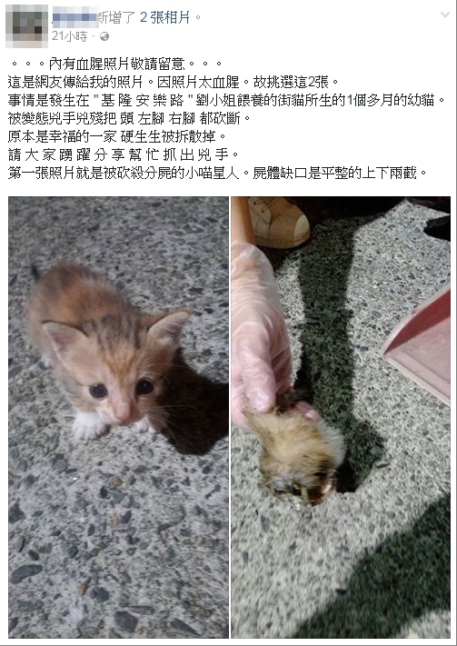 這名PO文的劉姓女子表示,「基隆安樂路劉小姐餵養約1個多月小的幼貓,竟被變態兇手把頭、右腳都砍斷,原本一家幸福,硬生生被拆散掉,請大家幫忙抓出兇手」,劉小姐相當難過的對貓媽媽說,「把寶貝交給阿姨,我一定幫你找出兇手!」