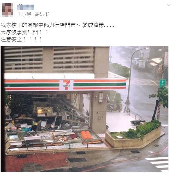 南台灣的災情還不只這樣,爆料公社中不斷有網友更新最新畫面,高雄還有一間像被子彈掃射過的711,整片玻璃被吹爆,超商內商品散落一地,網友紛紛在底下留言苦中作樂「腳踏車不動如山,但旁邊的小7!」、「這是颱風吹的嗎?好誇張喔!」、「真的太扯了!」、「大亨堡還在外面!」、「這下真的open了」、「確定是颱風不是恐攻嗎?」,也提醒民眾颱風天真的不要隨意外出,安全第一。