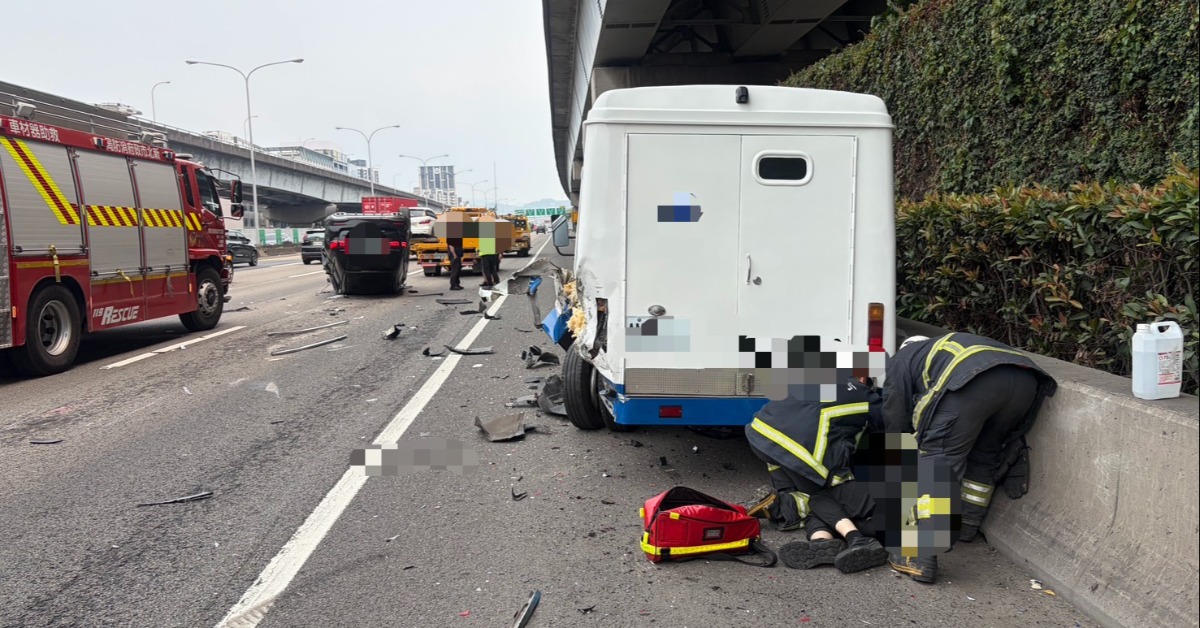員警:「車子車子,危險危險。」車禍現場三部車子撞得東倒西歪,受傷的四人或躺或坐表情痛苦,肇事的機車騎士第一個被載走送醫,另一名女騎士全身幾乎無法動彈,包紮後直接上擔架,另一頭的女騎士一直到被撞了還不知發生什麼事。