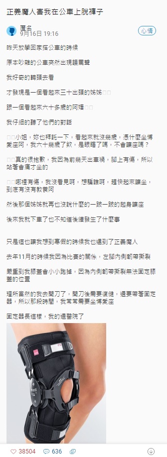 Dcard發文,他因左腳內側韌帶撕裂,做完復健後搭公車回家時選擇坐博愛座,卻遭約50多歲的婦人逼迫讓座,大學生忍無可忍只好脫褲證明:「我現在是殘障,不是只有幾歲才能坐!」