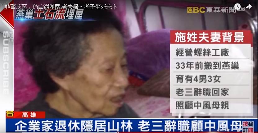 八旬施姓老夫妻,自己開螺絲工廠,有七個孩子,33年前他們搬到燕巢,退休後就享受住在依山傍水的環境中,為了照顧中風的媽媽三兒子還特地辭職回家同住。曾經充滿歡笑的家,如今因為梅姬颱風毀了,這個為了養老終身的家也已成追憶,而在今(29日),3人遺體均在母親房間內發現,屋主女兒表示,「已經有心理準備,謝謝爸媽讓我盡了孝道」。