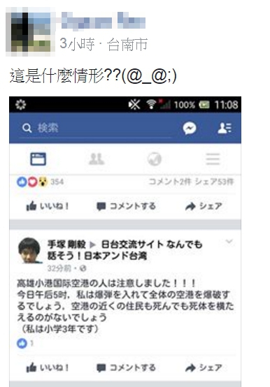 這名男子分別以「首塚剛毅」及「吴刚毅」的化名,今天早上在《台日交流論壇》、《日台交流広場(台湾と日本)》等等有關「台日交流」的臉書社團以日文貼文,內容寫道「請小港國際機場的人注意…今日下午五點我將會放置炸彈,我要讓小港的人屍橫遍野(我才國小3年級)。」