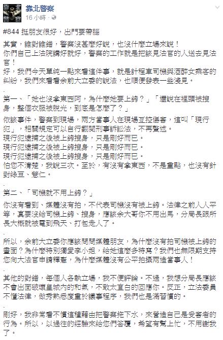 警察」發文,文章開頭就諷刺余天「挺朋友很好,出門要帶腦」,針對李妍憬被上銬還脫光光