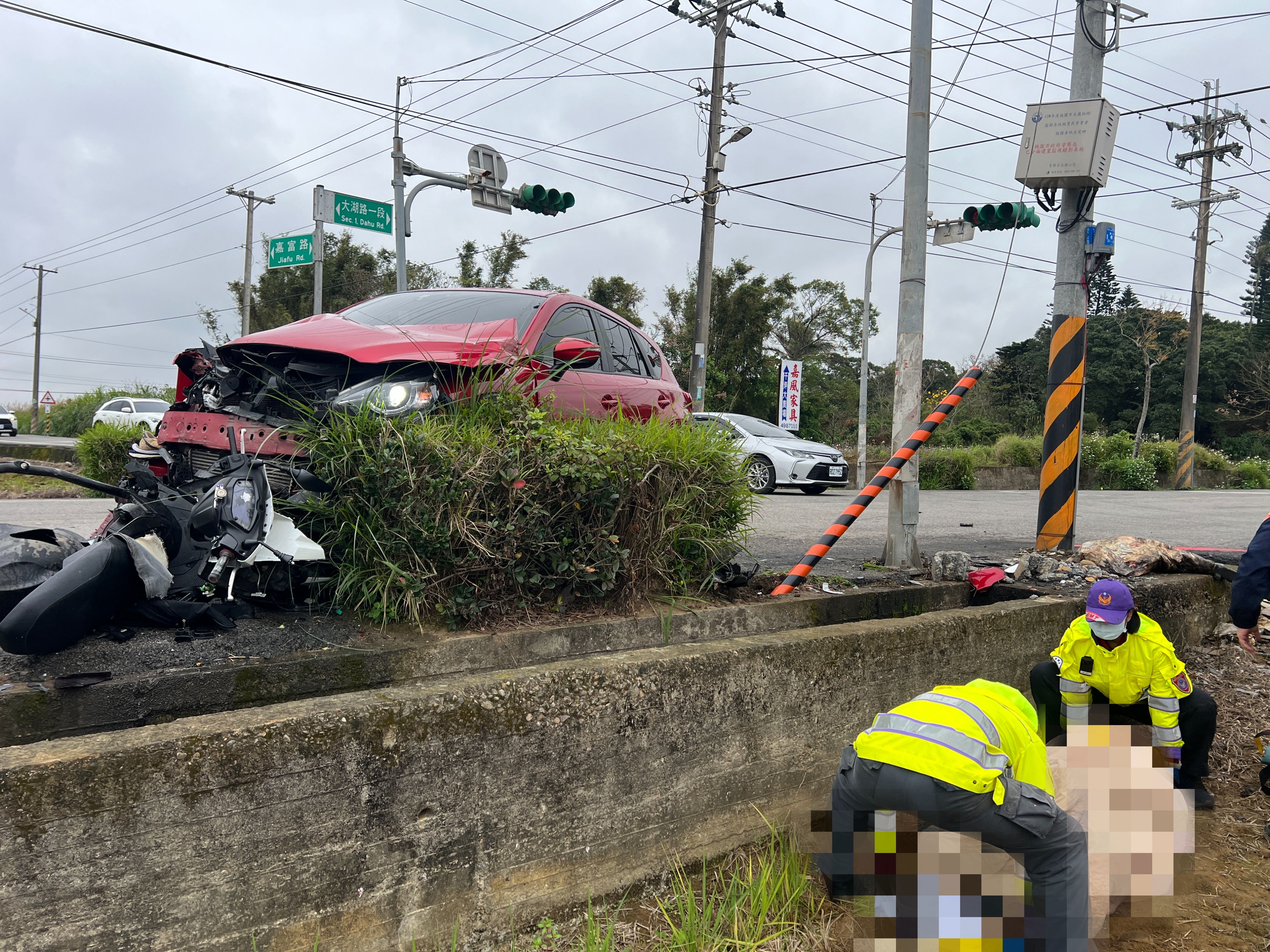 2車發生碰撞後,小客車的車頭全毀,而巨大撞擊力則讓呂男、葉女噴飛旁邊的田裡,而機車也被撞散只剩骨架,現場一片狼藉,當時有名下班的消防員聞聽撞擊聲後,立刻返回現場協助,無奈呂男經過急救,仍回天乏術。目前全案已報請檢察官相驗,詳細肇事原因待調查釐清中。