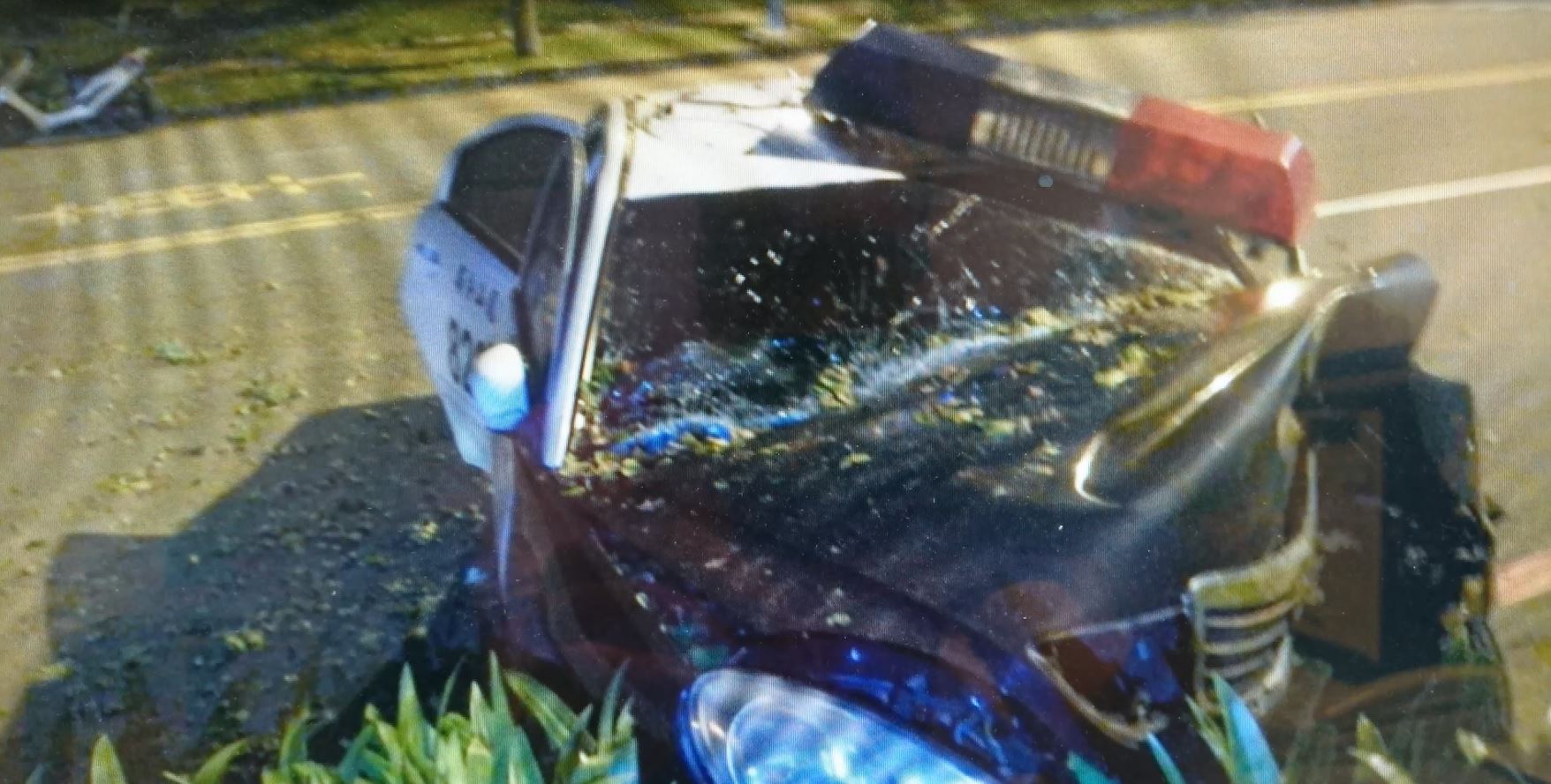 桃園市龜山分局在昨天(2日)清晨執勤時,2名員警為了追逐不願接受攔查的45歲劉姓男子,不慎在途中自撞路樹,警車車頭撞到凹陷全毀,車內的23歲涂姓男警右大腿開放性骨折,31歲陳姓