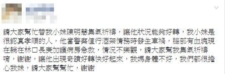 ▼陳姓女警的姊姊發文祈禱,希望能出現奇蹟讓妹妹好起來。(圖/翻攝自臉書)