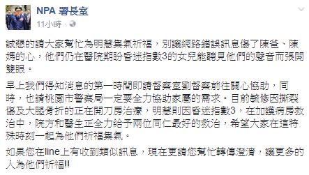 昏迷指數3,仍在和死神搏鬥。警方表示,陳姓女警剛畢業不到1年,今年7月才實習完畢開始警職,而女警家屬得知後非常擔心,其中姊姊就在臉書發了一篇祈福文,難過地說妹妹是個很認真孝順的人,請大家幫忙集氣祈禱,讓奇蹟出現趕快讓她好起來。