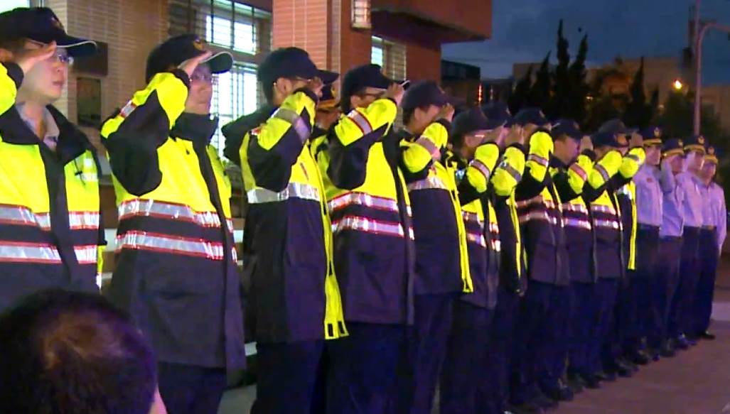 ▼龜山分局同袍們在警局前排成一列舉起手向她敬禮(圖/東森新聞)