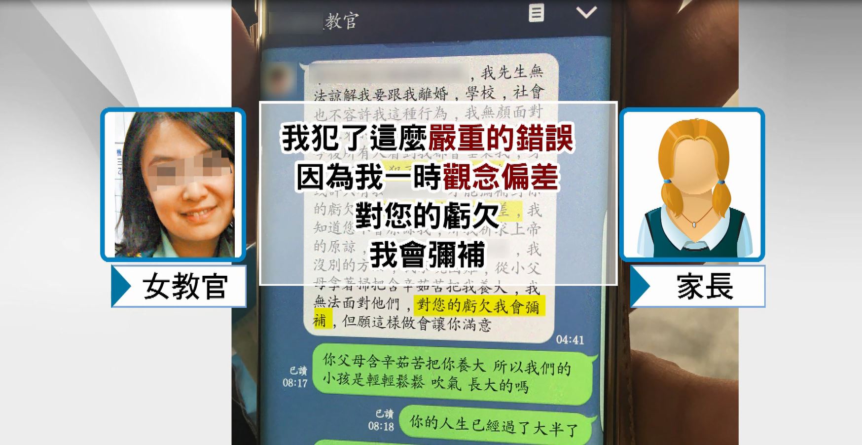 女學生家長出示女教官傳訊息給學生的對話內容「妳皮膚不錯不要畫太濃」、「口紅、基本妝就好」、「不要穿太暴露,氣質些」等言語猶如在酒店站臺叫賣的媽媽桑,遭家長痛批根本就是「初夜教戰守則」氣得向警方報案,結果女教官竟然自動提出願意以10萬元和解,事後還提高到50萬元,但都被女學生父親駁回,痛批「拿100萬元我也不接受」!