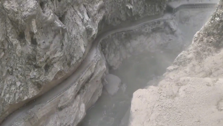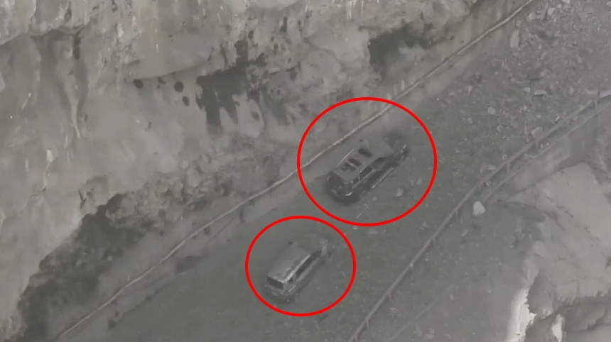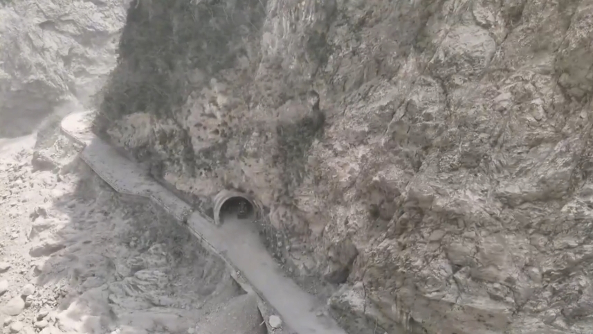 規模7.2強震昨(3)日重創花蓮。其中,中橫公路受到嚴重影響,多處有坍方的情形,透過空拍機畫面可看到,中橫公路呈現塵土飛揚的狀況,不僅大片山壁剝落,落石甚至直接滾進河道當中,還有2輛汽車卡在半路,被前方的砂石堵得動彈不得,險些被掩埋,而黑色的車窗全部碎裂,輪胎也卡進土石當中。
