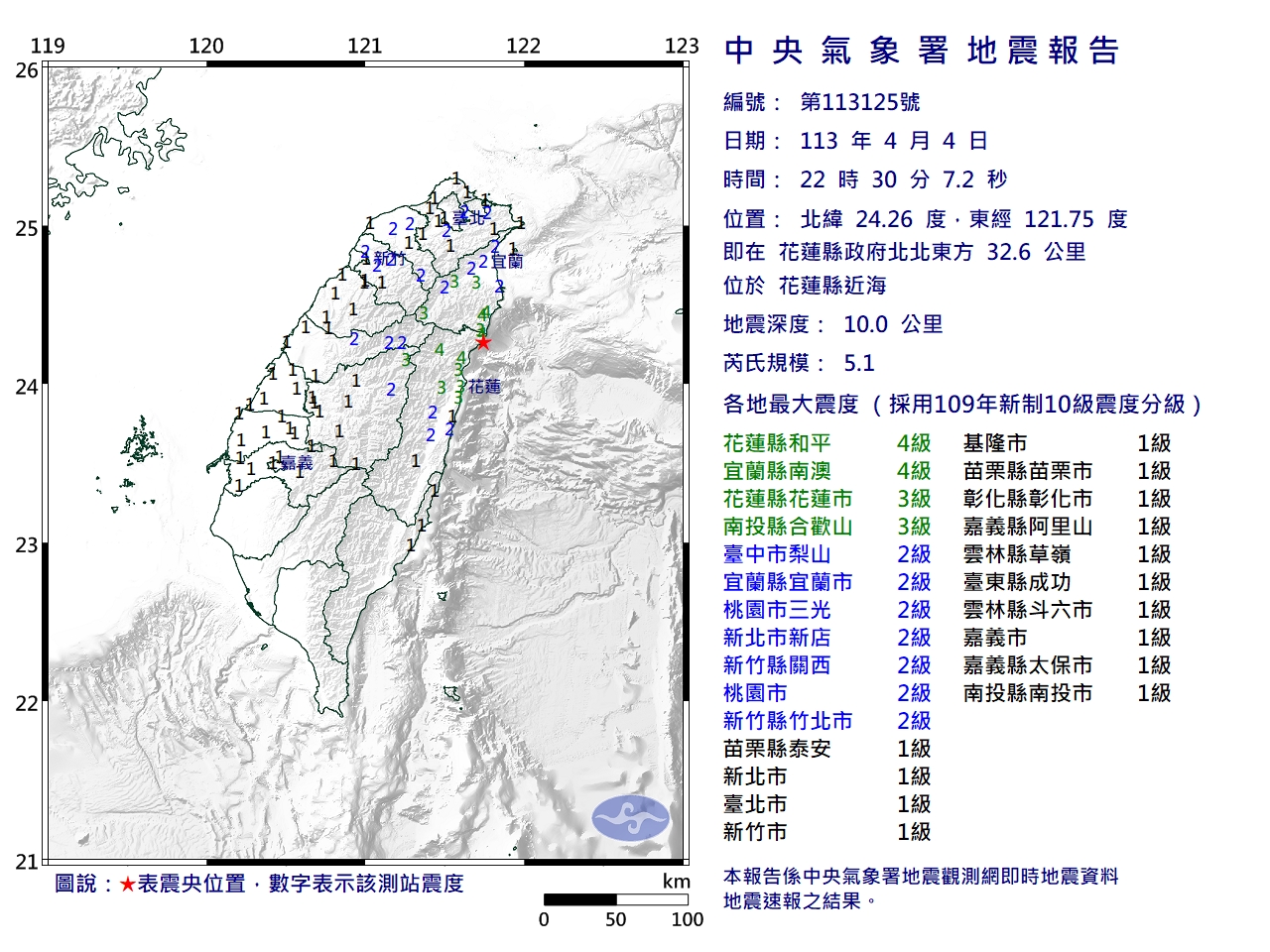 今(4)日晚間10點30分台灣再度發生地震。其中,東部地區有感。
