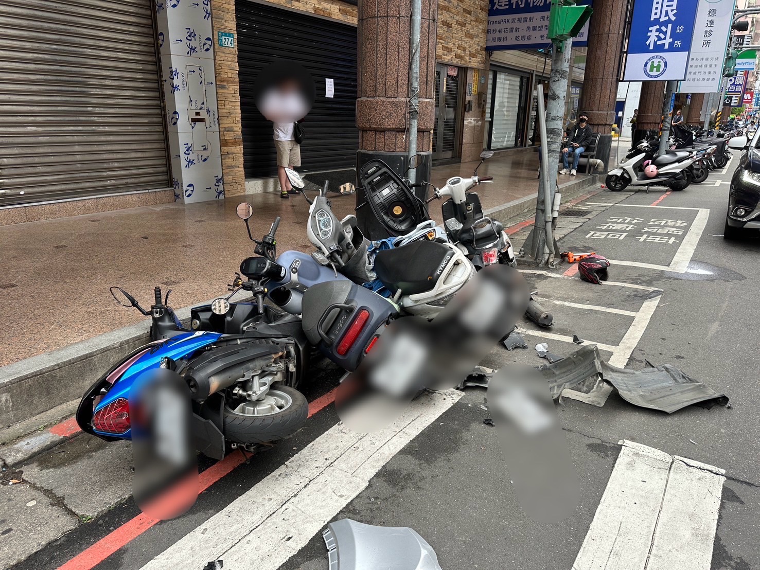 新北市新莊區中平路今(6)日上午10時30分許發生了一起車禍,警方接到報案後迅速趕到現場。一輛銀色小型客車突然失控,衝撞了路邊停放的21輛摩托車,接著駕駛還蓄意逃逸離開現場。