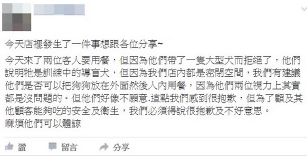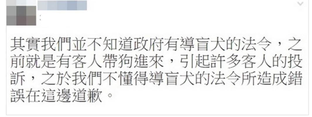 店家眼看情勢不對,16日晚間緊急在臉書發出道歉啟事,「其實我們並不知道政府有導盲犬的法令,之前就是有客人帶狗進來,引起許多客人的投訴,我們不懂得法令所造成的錯誤,在這邊道歉!」
