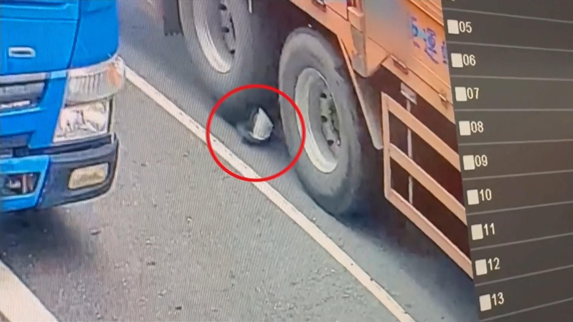 另一個監視畫面則看到,大貨車的車輪間卡了一頂安全帽,就是婦人戴的安全帽,但是大貨車和婦人擦撞後,卻是直接開走並沒有停下來,隨後就看到熱心的民眾,拿來交通錐擋住倒地的婦人,不要讓後方的車撞上來。
