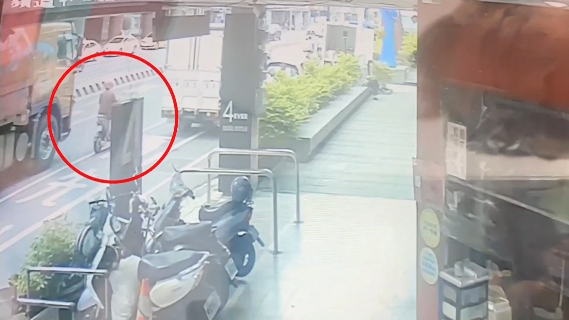 路邊店家的監視畫面,看到騎著電動單的的婦人,騎過了百貨公司前的西門路後,並行的一輛大貨車,隨後在路邊停車擋住的地方,大貨車和婦人發生了擦撞。周邊店家:「那輛,又繼續開了」。