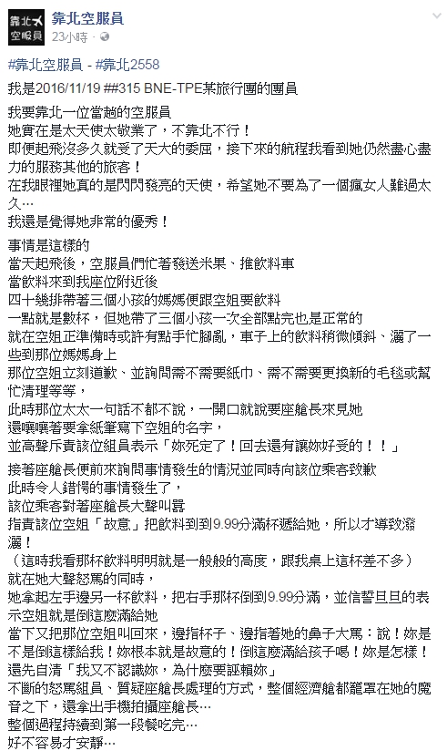 原PO強調,即便起飛沒多久,該名空服員就受了天大的委屈,但接下來的航程,看到她仍然盡心盡力的服務其他的旅客,忍不住想對她說「妳,才是這整架飛機上最美的風景」。而這一篇靠北文,也釣出該班機的座艙長,表示「心情一直到現在還無法平復,我的組員是天使無誤!」